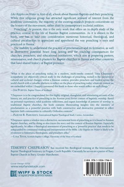 Like Ripples on Water is, first of all, a book about Russian Baptists and their preaching. While this religious group has attracted significant amount of interest from the academic community, the majority of the existing research projects concentrate on the history of the movement, rather than its contemporary ecclesial realities. Preaching? At present, this is the only work that offers an in-depth study of the practice, central to the life of Russian Baptist communities. As it is shown in the book, one has to take into consideration numerous historical, theological, and cultural peculiarities to appreciate and apprehend the way preaching is seen and practiced in Russia. The inability to understand the practice of proclamation and its formative, as well as destructive potential bears long lasting and far reaching consequences for churches, preachers, and educational institutions, which aim at preparing pastors, missionaries, and church planters for Baptist churches in Russia and other countries that have shared history of Baptist presence.