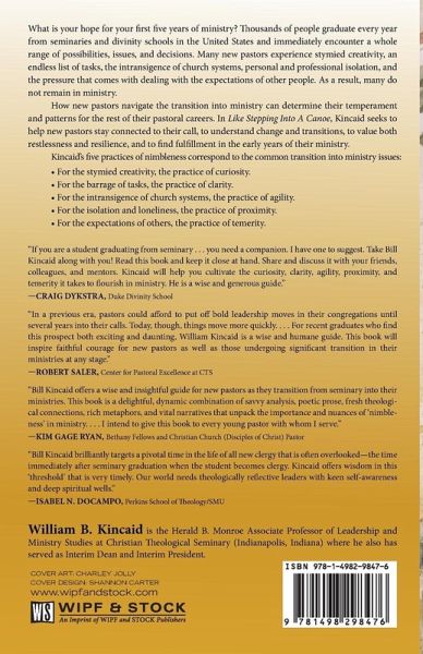 What is your hope for your first five years of ministry? Thousands of people graduate every year from seminaries and divinity schools in the United States and immediately encounter a whole range of possibilities, issues, and decisions. Many new pastors experience stymied creativity, an endless list of tasks, the intransigence of church systems, personal and professional isolation, and the pressure that comes with dealing with the expectations of other people. As a result, many do not remain in ministry. How new pastors navigate the transition into ministry can determine their temperament and patterns for the rest of their pastoral careers. In Like Stepping Into A Canoe, Kincaid seeks to help new pastors stay connected to their call, to understand change and transitions, to value both restlessness and resilience, and to find fulfillment in the early years of their ministry. Kincaid's five practices of nimbleness correspond to the common transition into ministry issues: For the stymied creativity, the practice of curiosity. For the barrage of tasks, the practice of clarity. For the intransigence of church systems, the practice of agility. For the isolation and loneliness, the practice of proximity. For the expectations of others, the practice of temerity.
