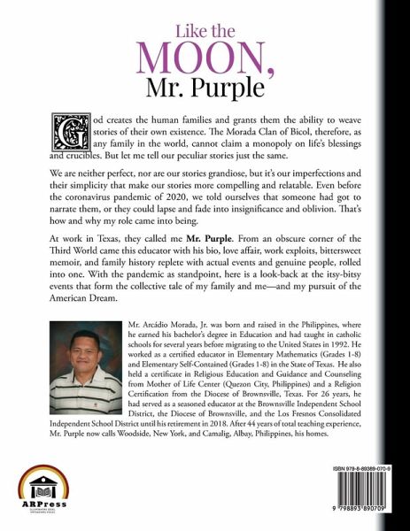 God creates the human families and grants them the ability to weave stories of their own existence. The Morada Clan of Bicol, therefore, as any family in the world, cannot claim a monopoly on life's blessings and crucibles. But let me tell our peculiar stories just the same. We are neither perfect, nor are our stories grandiose, but it's our imperfections and their simplicity that make our stories more compelling and relatable. Even before the coronavirus pandemic of 2020, we told ourselves that someone had got to narrate them, or they could lapse and fade into insignificance and oblivion. That's how and why my role came into being. At work in Texas, they called me Mr. Purple. from an obscure corner of the Third World came this educator with his bio, love affair, work exploits, bittersweet memoir, and family history replete with actual events and genuine people, rolled into one. With the pandemic as standpoint, here is a look-back at the itsy-bitsy events that form the collective tale of my family and me - and my pursuit of the American Dream.