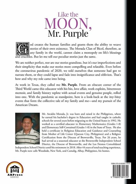 God creates the human families and grants them the ability to weave stories of their own existence. The Morada Clan of Bicol, therefore, as any family in the world, cannot claim a monopoly on life's blessings and crucibles. But let me tell our peculiar stories just the same. We are neither perfect, nor are our stories grandiose, but it's our imperfections and their simplicity that make our stories more compelling and relatable. Even before the coronavirus pandemic of 2020, we told ourselves that someone had got to narrate them, or they could lapse and fade into insignificance and oblivion. That's how and why my role came into being. At work in Texas, they called me Mr. Purple. from an obscure corner of the Third World came this educator with his bio, love affair, work exploits, bittersweet memoir, and family history replete with actual events and genuine people, rolled into one. With the pandemic as standpoint, here is a look-back at the itsy-bitsy events that form the collective tale of my family and me - and my pursuit of the American Dream.