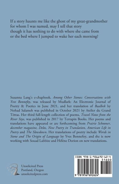 In this stunning abecedarian poetry collection by Susanna Lang, the words come to comfort, to exhilirate, and to ignite. Lang's e-chapbook, Among Other Stones: Conversations with Yves Bonnefoy, was released by Mudlark: An Electronic Journal of Poetry & Poetics in June 2021, and her translation of Baalbek by Nohad Salameh was published in October 2021 by Atelier du Grand Tétras. Her third full-length collection of poems, Travel Notes from the River Styx, was published in 2017 by Terrapin Books. Her poems and translations have appeared or are forthcoming from Prairie Schooner, december magazine, Delos, New Poetry in Translation, American Life in Poetry and The Slowdown. Her translations of poetry include Words in Stone and The Origin of Language by Yves Bonnefoy, and she is now working with Souad Labbize and Hélène Dorion on new translations.