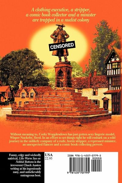 A clothing executive, a stripper, a comic book collector and a minister are stuck in a nudist colony! Without meaning to, Corky Wopplesdown has just gotten sexy lingerie model, Wisper Nuckeby, fired. In an effort to somehow make things right he sets off on a wild journey to find her while in the unlikely company of a rude, horny stripper, a repressed minister, an unexpeced fiancee and a comic book collecting pervert. Then Corky's car breaks down in the tiny hamlet of Nikkid Bottoms, a little, coastal village where the sun is warm, the people are nice, and the clothing is optional. Funny, edgy and wickedly satirical, this is the irreverent Chuck Austen writing at his ingeniously zany, and unbelievably outrageous best. Fully illustrated.