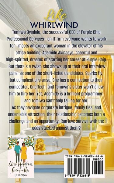 Tomiwa Oyinlolu is the successful CEO of Purple Chip Professional Services, the IT firm that everyone wants to work for. One day he meets an exuberant woman in the elevator of his office building and she completely mesmerises him. The thing, she shows up at their oral interview panel as one of the ten short-listed candidates from a pool of over a hundred. It is unfortunate she has a connection to the owner of their competitor, One Tech. Worse, his sister has a spy in the rival company and she won't let him hire the young lady. The problem is, she is a brilliant programmer, and it seems he has fallen for her. Cheerful, high-spirited Ademide Akinseye's dream has always been to start her career in Purple Chip Professional Services. On the side, she ushers at parties to make ends meet. The man she encounters on her way to interview attentively listens to her light-hearted chatter about her day, philosophies, and plans to join Purple Chip as a programmer. Then she arrives at the job assessment and realises she's been blabbing to the founder and owner of Purple Chip. Although the cards are stacked against her, she isn't about to give up on her dreams.