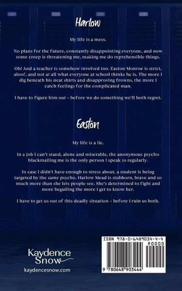 From International Bestselling author Kaydence Snow, comes a student-teacher romance full of suspense and forbidden heat. Harlow My life is a mess. No plans for the future, constantly disappointing everyone, and now some creep is threatening me, making me do reprehensible things. Oh! And a teacher is somehow involved too. Easton Monroe is strict, aloof, and not at all what everyone at school thinks he is. The more I dig beneath his neat shirts and disapproving frowns, the more I catch feelings for the complicated man. I have to figure him out - before we do something we'll both regret. Easton My life is a lie. In a job I can't stand, alone and miserable, the anonymous psycho blackmailing me is the only person I speak to regularly. In case I didn't have enough to stress about, a student is being targeted by the same psycho. Harlow Mead is stubborn, brave and so much more than she lets people see. She's determined to fight and more beguiling the more I get to know her. I have to get us out of this deadly situation - before I ruin us both.¿