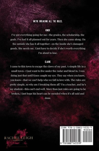 Knox I've got everything going for me-the grades, the scholarship, the goals. I've had it all planned out for years. Then she came along. On the outside she has it all together-on the inside she's damaged goods. She needs me. I just have to decide if she's worth everything I'm about to lose. Claire I came to this town to escape the claws of my past. A simple life in a small town-I just want to live under the radar and blend in. I was doing just that until Knox caught my eye. They say when you know, you know-that we can't help who we fall in love with. The rules are pretty simple, so why am I breaking them all? I'm a teacher, and he's my student-this can't end well. More than just rules are going to be broken, I just hope his heart can be mended when it's all said and done.