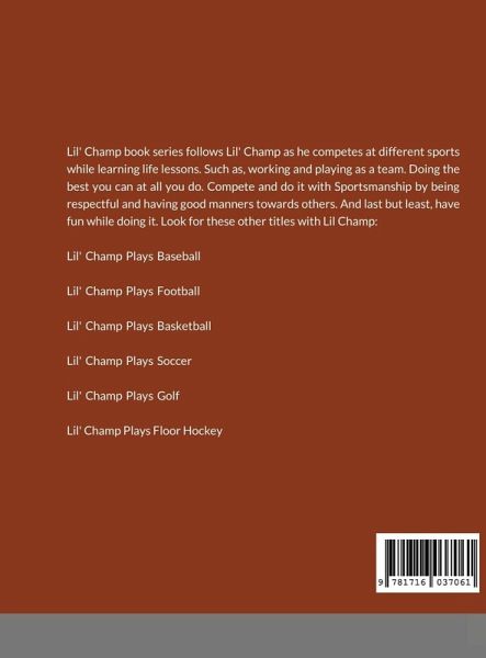 Lil' Champ book series follows Lil' Champ as he competes at different sports while learning life lessons. Such as, working and playing as a team. Doing the best you can at all you do. Compete and do it with Sportsmanship by being respectful and having good manners towards others. And last but least, have fun while doing it. Look for these other titles with Lil Champ: Lil' Champ Plays Baseball Lil' Champ Plays Football Lil' Champ Plays Basketball Lil' Champ Plays Soccer Lil' Champ Plays Golf Lil' Champ Plays Floor Hockey
