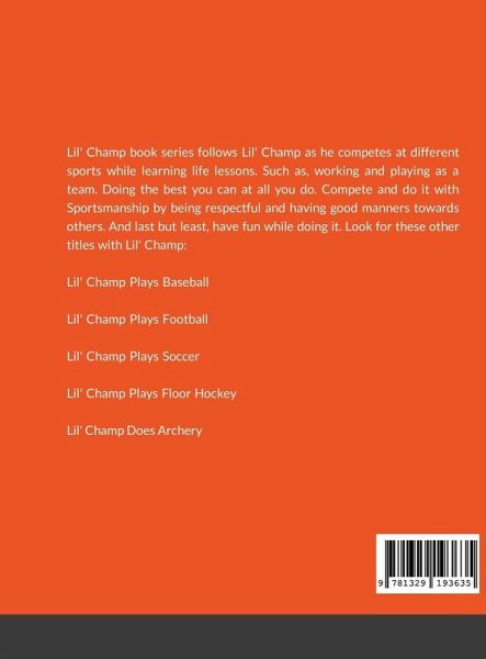 Lil' Champ book series follows Lil' Champ as he competes at different sports while learning life lessons. Such as, working and playing as a team. Doing the best you can at all you do. Compete and do it with Sportsmanship by being respectful and having good manners towards others. And last but least, have fun while doing it. Look for these other titles with Lil' Champ: Lil' Champ Plays Baseball Lil' Champ Plays Football Lil' Champ Plays Soccer Lil' Champ Plays Floor Hockey Lil' Champ Does Archery