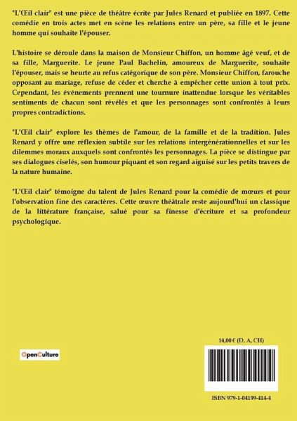 Un regard perçant sur la vie quotidienne, ' L'il clair ' de Jules Renard nous transporte dans la France rurale de la fin du XIXe siècle. À travers une série de vignettes, l'auteur dépeint avec une précision chirurgicale les petites joies et les grandes peines des habitants d'un village. L'uvre se distingue par son style concis et son humour subtil, révélant les complexités de la condition humaine. Renard, avec son talent d'observateur, capte l'essence des relations humaines et des interactions sociales, offrant une fresque vivante et authentique de la vie provinciale. Les thèmes de l'isolement, de la nature et de la simplicité de la vie campagnarde sont omniprésents, et Renard les aborde avec une sensibilité qui touche le lecteur. Ce récit, à la fois introspectif et universel, explore les nuances de l'existence à travers des personnages attachants et des situations du quotidien. L'auteur nous invite à réfléchir sur la beauté des choses simples et sur la profondeur des émotions humaines. En nous immergeant dans cet univers, ' L'il clair ' nous offre une perspective nouvelle sur la vie rurale et ses habitants. Par sa capacité à capturer l'essence de la vie avec une telle acuité, ce livre nous enseigne à apprécier les détails qui composent notre propre existence.
