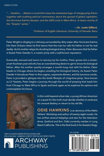 "… Hawkins … delivers a novel that mixes the streetwise lingo of vintage pimp fiction together with scathing satirical commentary about the spread of global capitalism, the Hurricane Katrina disaster, and the AIDS crisis in West Africa. A classic worthy of the "Sweets" series." —Dr. Justin Gifford, Professor of English Literature, University of Nevada, Reno Peter Wright is clinging to a chimney surrounded by dirty water after Hurricane Katrina hits New Orleans when he first learns that the man he calls his father is not his real daddy. As his mother relays his shocking biological story, Peter discovers that his father is Sweet Peter Deeder II, a master pimp with a well-known reputation. Eventually rescued and sworn to secrecy by his mother, Peter grows into a street-smart fourteen-year-old who has an overwhelming desire to get to know his biological father. After his mother quietly arranges a month-long visit with his father, Peter heads to Chicago where he begins unveiling his biological history. As Sweet Peter Deeder II introduces Peter to fine cognac, expensive dinners, and his luxurious condo, Peter is provided a glimpse into the lavish lifestyle of a big-time pimp. Now known as Lil’ Sweets, Peter begins a journey through the world of pimping that leads him from Chicago to West Africa to Spain and back again as he explores his options and contemplates his future. In this multi-layered urban tale, a young African American on a quest for the truth must decide whether to embrace his unusual destiny or return to his old life.
