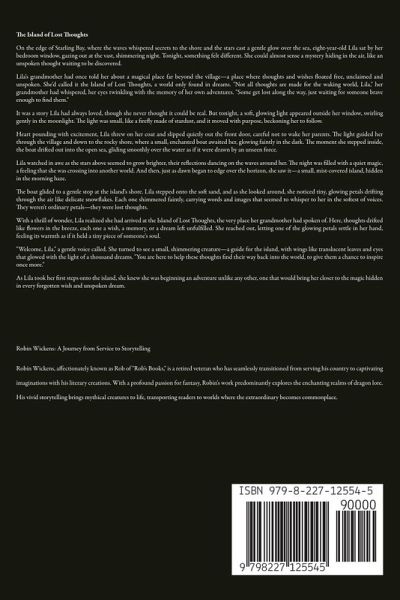The Island of Lost Thoughts On the edge of Starling Bay, where the waves whispered secrets to the shore and the stars cast a gentle glow over the sea, eight-year-old Lila sat by her bedroom window, gazing out at the vast, shimmering night. Tonight, something felt different. She could almost sense a mystery hiding in the air, like an unspoken thought waiting to be discovered. Lila's grandmother had once told her about a magical place far beyond the village-a place where thoughts and wishes floated free, unclaimed and unspoken. She'd called it the Island of Lost Thoughts, a world only found in dreams. "Not all thoughts are made for the waking world, Lila," her grandmother had whispered, her eyes twinkling with the memory of her own adventures. "Some get lost along the way, just waiting for someone brave enough to find them." It was a story Lila had always loved, though she never thought it could be real. But tonight, a soft, glowing light appeared outside her window, swirling gently in the moonlight. The light was small, like a firefly made of stardust, and it moved with purpose, beckoning her to follow. Heart pounding with excitement, Lila threw on her coat and slipped quietly out the front door, careful not to wake her parents. The light guided her through the village and down to the rocky shore, where a small, enchanted boat awaited her, glowing faintly in the dark. The moment she stepped inside, the boat drifted out into the open sea, gliding smoothly over the water as if it were drawn by an unseen force. Lila watched in awe as the stars above seemed to grow brighter, their reflections dancing on the waves around her. The night was filled with a quiet magic, a feeling that she was crossing into another world. And then, just as dawn began to edge over the horizon, she saw it-a small, mist-covered island, hidden in the morning haze. The boat glided to a gentle stop at the island's shore. Lila stepped onto the soft sand, and as she looked around, she noticed tiny, glowing petals drifting through the air like delicate snowflakes. Each one shimmered faintly, carrying words and images that seemed to whisper to her in the softest of voices. They weren't ordinary petals-they were lost thoughts. With a thrill of wonder, Lila realized she had arrived at the Island of Lost Thoughts, the very place her grandmother had spoken of. Here, thoughts drifted like flowers in the breeze, each one a wish, a memory, or a dream left unfulfilled. She reached out, letting one of the glowing petals settle in her hand, feeling its warmth as if it held a tiny piece of someone's soul. "Welcome, Lila," a gentle voice called. She turned to see a small, shimmering creature-a guide for the island, with wings like translucent leaves and eyes that glowed with the light of a thousand dreams. "You are here to help these thoughts find their way back into the world, to give them a chance to inspire once more." As Lila took her first steps onto the island, she knew she was beginning an adventure unlike any other, one that would bring her closer to the magic hidden in every forgotten wish and unspoken dream.
