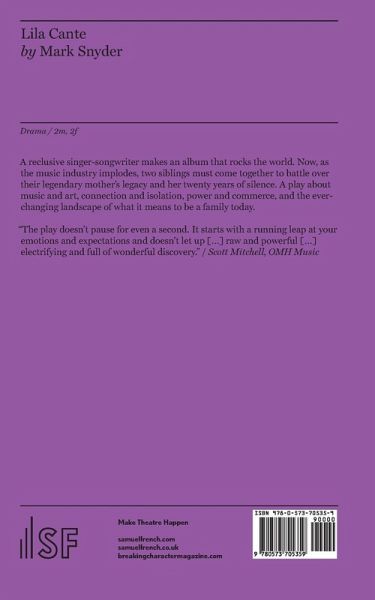 "A reclusive singer-songwriter makes an album that rocks the world. Now, as the music industry implodes, two siblings must come together to battle over their legendary mother's legacy and her twenty years of silence. A play about music and art, connection and isolation, power and commerce, and the ever-changing landscape of what it means to be a family today"--Page [4] of cover.