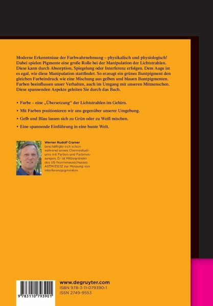 Dieses Buch beschreibt moderne Erkenntnisse der Farbwahrnehmung, die auf physikalischen und physiologischen Phänomenen basiert. Dargestellt werden die Vorgänge vor unserem Auge und die Umsetzung hinter unserem Auge (Gehirn). Dabei spielen Pigmente eine große Rolle bei der Manipulation der Lichtstrahlen. Diese Manipulation kann unterschiedlich sein und durch Absorption, Spiegelung oder Interferenz erfolgen. Allerdings ist es dem Auge egal, wie diese Manipulation stattfindet. Ein grünes Buntpigment erzeugt den gleichen Farbeindruck wie eine Mischung aus einem gelben und einem blauen Buntpigment.