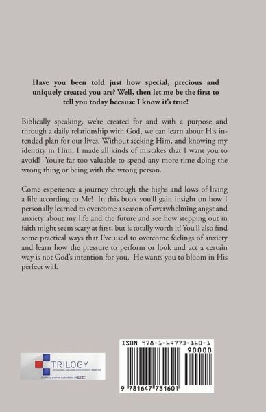 Have you been told just how special, precious and uniquely created you are? Well, then let me be the first to tell you today because I know it's true! Biblically speaking, we're created for and with a purpose and through a daily relationship with God, we can learn about His intended plan for our lives. Without seeking Him, and knowing my identity in Him, I made all kinds of mistakes that I want you to avoid! You're far too valuable to spend any more time doing the wrong thing or being with the wrong person. Come experience a journey through the highs and lows of living a life according to Me! In this book you'll gain insight on how I personally learned to overcome a season of overwhelming angst and anxiety about my life and the future and see how stepping out in faith might seem scary at first, but is totally worth it! You'll also find some practical ways that I've used to overcome feelings of anxiety and learn how the pressure to perform or look and act a certain way is not God's intention for you. He wants you to bloom in His perfect will.