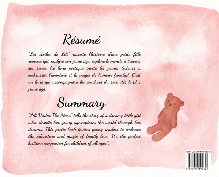 Lili Under the Stars tells the touching story of a dreamy little girl. With her cuddly toy in her arms and her eyes turned to the sky, Lili falls asleep under the stars of America, dreaming of distant lands: Africa, France, Italy, and even Jamaica. Thanks to its bilingual text, in French and English, this poetic book invites young readers to discover the world, feel the warmth of family love, and embrace the magic of dreams. Perfect for calm evening moments, Lili Under the Stars wraps children in tenderness and takes them on an imaginary journey full of light and comfort. ✨ A poetic gift for children ages 0 to 6 ✨ Bilingual text: French and English side by side ✨ Perfect for multicultural families, baby showers, or bedtime libraries "When you look at the sky, remember, my darling, Each star shines for you, like a gentle kind of magic..."