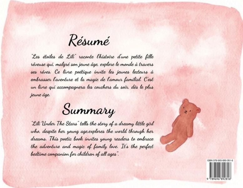 Lili Under the Stars tells the touching story of a dreamy little girl. With her cuddly toy in her arms and her eyes turned to the sky, Lili falls asleep under the stars of America, dreaming of distant lands: Africa, France, Italy, and even Jamaica. Thanks to its bilingual text, in French and English, this poetic book invites young readers to discover the world, feel the warmth of family love, and embrace the magic of dreams. Perfect for calm evening moments, Lili Under the Stars wraps children in tenderness and takes them on an imaginary journey full of light and comfort. ✨ A poetic gift for children ages 0 to 6 ✨ Bilingual text: French and English side by side ✨ Perfect for multicultural families, baby showers, or bedtime libraries "When you look at the sky, remember, my darling, Each star shines for you, like a gentle kind of magic..."