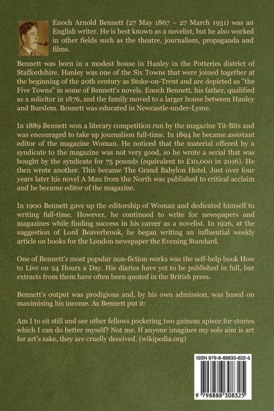 A tragic love story with a placid, if not happy, ending by Enoch Arnold Bennett (27 May 1867 - 27 March 1931). He was an English writer. He is best known as a novelist, but he also worked in other fields such as the theatre, journalism, propaganda and films. Bennett was born in a modest house in Hanley in the Potteries district of Staffordshire. Hanley was one of the Six Towns that were joined together at the beginning of the 20th century as Stoke-on-Trent and are depicted as "the Five Towns" in some of Bennett's novels. Enoch Bennett, his father, qualified as a solicitor in 1876, and the family moved to a larger house between Hanley and Burslem. Bennett was educated in Newcastle-under-Lyme. In 1889 Bennett won a literary competition run by the magazine Tit-Bits and was encouraged to take up journalism full-time. In 1894 he became assistant editor of the magazine Woman. He noticed that the material offered by a syndicate to the magazine was not very good, so he wrote a serial that was bought by the syndicate for 75 pounds (equivalent to £10,000 in 2016). He then wrote another. This became The Grand Babylon Hotel. Just over four years later his novel A Man from the North was published to critical acclaim and he became editor of the magazine. In 1900 Bennett gave up the editorship of Woman and dedicated himself to writing full-time. However, he continued to write for newspapers and magazines while finding success in his career as a novelist. In 1926, at the suggestion of Lord Beaverbrook, he began writing an influential weekly article on books for the London newspaper the Evening Standard. One of Bennett's most popular non-fiction works was the self-help book How to Live on 24 Hours a Day. His diaries have yet to be published in full, but extracts from them have often been quoted in the British press. Bennett's output was prodigious and, by his own admission, was based on maximising his income. As Bennett put it: Am I to sit still and see other fellows pocketing two guineas apiece for stories which I can do better myself? Not me. If anyone imagines my sole aim is art for art's sake, they are cruelly deceived. (wikipedia.org)