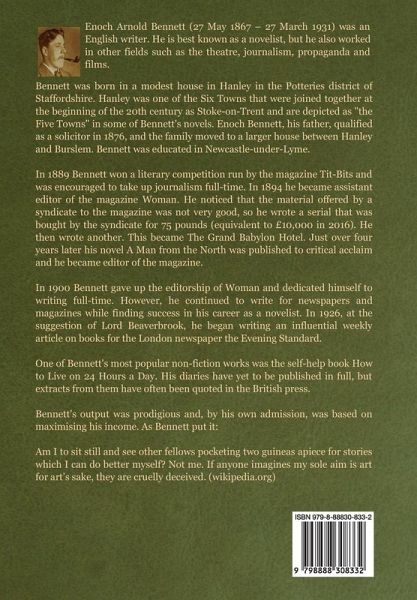 A tragic love story with a placid, if not happy, ending by Enoch Arnold Bennett (27 May 1867 - 27 March 1931). He was an English writer. He is best known as a novelist, but he also worked in other fields such as the theatre, journalism, propaganda and films. Bennett was born in a modest house in Hanley in the Potteries district of Staffordshire. Hanley was one of the Six Towns that were joined together at the beginning of the 20th century as Stoke-on-Trent and are depicted as "the Five Towns" in some of Bennett's novels. Enoch Bennett, his father, qualified as a solicitor in 1876, and the family moved to a larger house between Hanley and Burslem. Bennett was educated in Newcastle-under-Lyme. In 1889 Bennett won a literary competition run by the magazine Tit-Bits and was encouraged to take up journalism full-time. In 1894 he became assistant editor of the magazine Woman. He noticed that the material offered by a syndicate to the magazine was not very good, so he wrote a serial that was bought by the syndicate for 75 pounds (equivalent to £10,000 in 2016). He then wrote another. This became The Grand Babylon Hotel. Just over four years later his novel A Man from the North was published to critical acclaim and he became editor of the magazine. In 1900 Bennett gave up the editorship of Woman and dedicated himself to writing full-time. However, he continued to write for newspapers and magazines while finding success in his career as a novelist. In 1926, at the suggestion of Lord Beaverbrook, he began writing an influential weekly article on books for the London newspaper the Evening Standard. One of Bennett's most popular non-fiction works was the self-help book How to Live on 24 Hours a Day. His diaries have yet to be published in full, but extracts from them have often been quoted in the British press. Bennett's output was prodigious and, by his own admission, was based on maximising his income. As Bennett put it: Am I to sit still and see other fellows pocketing two guineas apiece for stories which I can do better myself? Not me. If anyone imagines my sole aim is art for art's sake, they are cruelly deceived. (wikipedia.org)