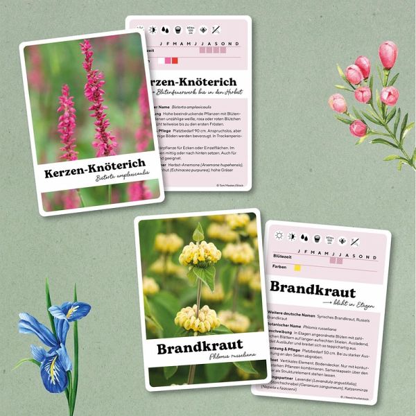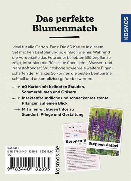 Ideal für alle Garten-Fans: Die 60 handlichen und stabilen Karten in diesem Set machen Beetplanung so einfach wie nie. Während die Vorderseite eine beliebte Blütenpflanze zeigt, informiert die Rückseite über Licht-, Wasser- und Nährstoffbedarf, Wuchshöhe sowie viele weitere Eigenschaften der Pflanze. So können schnell und unkompliziert die besten Pflanzpartner gefunden werden.
