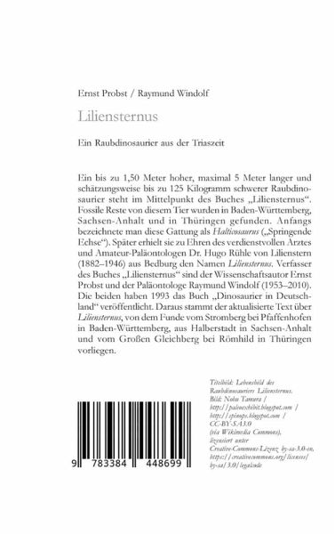 Ein bis zu 1,50 Meter hoher, maximal 5 Meter langer und schätzungsweise bis zu 125 Kilogramm schwerer Raubdinosaurier steht im Mittelpunkt des Buches "Liliensternus". Fossile Reste von diesem Tier wurden in Baden-Württemberg, Sachsen-Anhalt und in Thüringen gefunden. Anfangs bezeichnete man diese Gattung als Halticosaurus ("Springende Echse"). Später erhielt sie zu Ehren des verdienstvollen Arztes und Amateur-Paläontologen Dr. Hugo Rühle von Lilienstern (1882-1946) aus Bedburg den Namen Liliensternus. Verfasser des Taschenbuches "Liliensternus" sind der Wissenschaftsautor Ernst Probst und der Paläontologe Raymund Windolf (1953-2010). Die beiden haben 1993 das Buch "Dinosaurier in Deutschland" veröffentlicht. Daraus stammt der aktualisierte Text über Liliensternus, von dem Funde vom Stromberg bei Pfaffenhofen in Baden-Württemberg, aus Halberstadt in Sachsen-Anhalt und vom Großen Gleichberg bei Römhild in Thüringen vorliegen.