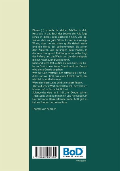 Dieses (...) schreib dir, kleiner Schüler, in dein Herz, wie in das Buch des Lebens ein. Alle Tage schau in dieses dein Büchlein hinein, und gewöhne dich an gute Sitten. Es sind nur wenige Worte; aber sie enthalten große Geheimnisse, und die Werke der Vollkommenen. Sie zieren dein Äußeres, und beruhigen dein Inneres. In der Verachtung und Abtötung seiner selbst liegt der Anfang und das Wachstum der Gottseligkeit, die zur Anschauung Gottes führt.Niemand steht fest, außer allein in Gott. Die Liebe zu Gott ist ein fester Grund, und der Demut wird diese Gnade gegeben.Wer auf Gott vertraut, der erträgt alles mit Geduld: und wer Gott aus reiner Absicht sucht, der wird leicht zufrieden sein.Wer sich selbst sucht, wird sich selbst finden. Wer auf jedes Wort antworten will, der wird erfahren, daß es ihm schädlich sei.So lange das Herz nur in irdischen Dingen seinen Trost sucht, wird es immer hin und her wogen. In Gott ist wahre Herzensfreude; außer Gott gibt es keinen Frieden und keine Ruhe.Thomas von Kempen