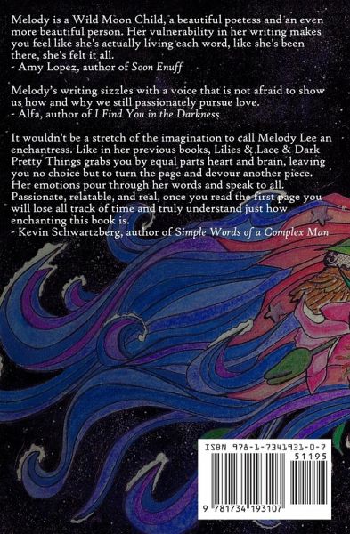 Melody Lee writes intimately and passionately on subjects close to her heart: love, loss, nature, optimism, being human, and she does it poignantly with her trademark warrior spirit. Lee assures her readers it is wonderful to be different, to be yourself, to stand out, to not fall into the crowd mentality, because that's the essence of freedom and how one shines. You feel the fire in Lee's words and her sensitive, compassionate spirit as revealed through her poetry, writing for the dreamers, the free spirits, and the romantic eccentrics in all of us, indulging in the voice of her soul. She is an intuitive, an alchemist, her inspiration resonates with both the feminine and masculine parts of us. She brings her experiences into magical poems, painting ethereal pictures of love, nature, and beauty, as she opens more of her soul to the world. Lee doesn't shy away from expressing the dark side of human nature. Lilies & Lace & Dark Pretty Things brings comfort in a world that could use more imagination, love, kindness, and compassion. You feel this in every poem Lee writes. The free spirited, romantic, moon child. The eternal optimist. The effervescent butterfly.