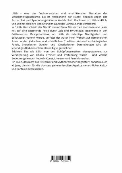 Lilith - eine der faszinierendsten und umstrittensten Gestalten der Menschheitsgeschichte. Sie ist Herrscherin der Nacht, Rebellin gegen das Patriarchat und Symbol ungezähmter Weiblichkeit. Doch wer ist Lilith wirklich, und wie hat sich ihre Bedeutung im Laufe der Jahrtausende verändert?In "Lilith: Herrscherin der Nacht" nimmt Faruk Nasser die Leserinnen und Leser mit auf eine spannende Reise durch Zeit und Mythologie. Beginnend in den Götterwelten Mesopotamiens, wo Lilith als mächtige Nachtgestalt und Schutzgeist verehrt wurde, verfolgt der Autor ihren Wandel zur dämonischen Ikone in der jüdischen und christlichen Tradition. Anhand archäologischer Funde, literarischer Quellen und künstlerischer Darstellungen wird ein lebendiges Bild dieser komplexen Figur gezeichnet.Erfahren Sie, wie Lilith von den Schöpfungsmythen Mesopotamiens zur Verkörperung von Chaos, Freiheit und Verführung wurde - und welche Bedeutung sie noch heute in Kunst, Literatur und Feminismus hat.Ein Buch, das nicht nur Historiker und Mythenforscher begeistert, sondern auch all jene, die sich für die dunklen, geheimnisvollen Aspekte menschlicher Kultur und Fantasie interessieren.
