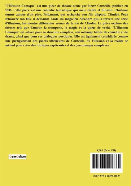 "L'Illusion Comique" est une pièce de théâtre écrite par Pierre Corneille, publiée en 1636. Cette pièce est une comédie fantastique qui mêle réalité et illusion. L'histoire tourne autour d'un père, Pridamant, qui recherche son fils disparu, Clindor. Pour retrouver son fils, il demande l'aide du magicien Alcandre qui, à travers une série d'illusions, lui montre différentes scènes de la vie de Clindor. La pièce explore des thèmes tels que l'amour, la tromperie, la magie et la quête de vérité. "L'Illusion Comique" est saluée pour sa structure complexe, son mélange habile de comédie et de drame, ainsi que pour ses dialogues poétiques. Elle est également considérée comme une préfiguration des pièces ultérieures de Corneille, où l'illusion et la réalité se mêlent pour créer des intrigues captivantes et des personnages complexes.