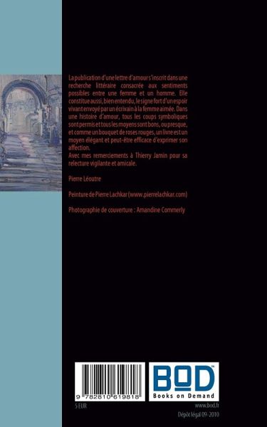 La publication d'une lettre d'amour s'inscrit dans une recherche littéraire consacrée aux sentiments possibles entre une femme et un homme. Elle constitue aussi, bien entendu, le signe fort d'un espoir vivant envoyé par un écrivain à la femme aimée. Dans une histoire d'amour, tous les coups symboliques sont permis et tous les moyens sont bons, ou presque, et comme un bouquet de roses rouges, un livre est un moyen élégant et peut-être efficace d'exprimer son affection.Peinture de Pierre Lachkar (www.pierrelachkar.com)Photographie de couverture : Amandine Commerly