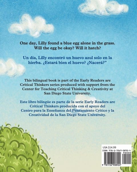 A bilingual (English & Spanish) children's book and part of the Early Readers are Critical Thinkers series produced with support from the Center for Teaching Critical Thinking & Creativity at San Diego State University. This is true story about a girl named Lilly who found a robin's egg alone in the grass and tried to help it hatch. Will the egg hatch? Will the baby bird be okay? Let's follow the curious mind of Lilly and find out!