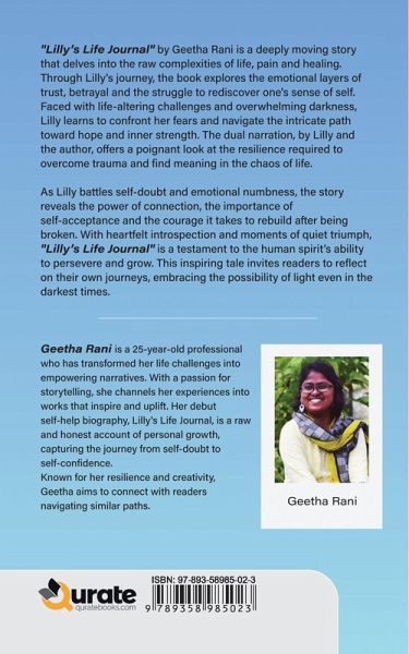 "Lilly's Life Journal" by Geetha Rani is a deeply moving story that delves into the raw complexities of life, pain and healing. Through Lilly's journey, the book explores the emotional layers of trust, betrayal and the struggle to rediscover one's sense of self. Faced with life-altering challenges and overwhelming darkness, Lilly learns to confront her fears and navigate the intricate path toward hope and inner strength. The dual narration, by Lilly and the author, offers a poignant look at the resilience required to overcome trauma and find meaning in the chaos of life. As Lilly battles self-doubt and emotional numbness, the story reveals the power of connection, the importance of self-acceptance and the courage it takes to rebuild after being broken. With heartfelt introspection and moments of quiet triumph, "Lilly's Life Journal" is a testament to the human spirit's ability to persevere and grow. This inspiring tale invites readers to reflect on their own journeys, embracing the possibility of light even in the darkest times. About the Author: Geetha Rani is a 25-year-old professional who has transformed her life challenges into empowering narratives. With a passion for storytelling, she channels her experiences into works that inspire and uplift. Her debut self-help biography, Lilly's Life Journal, is a raw and honest account of personal growth, capturing the journey from self-doubt to self-confidence. Known for her resilience and creativity, Geetha aims to connect with readers navigating similar paths.