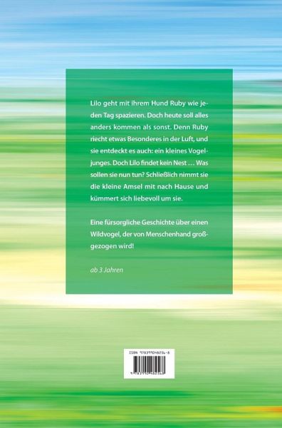 Lilo geht mit ihrem Hund Ruby wie jeden Tag spazieren. Doch heute soll alles anders kommen als sonst. Denn Ruby riecht etwas Besonderes in der Luft, und sie entdeckt es auch: ein kleines Vogeljunges. Doch Lilo findet kein Nest ... Was sollen sie nun tun? Schließlich nimmt sie die kleine Amsel mit nach Hause und kümmert sich liebevoll um sie. Eine fürsorgliche Geschichte über einen Wildvogel, der von Menschenhand großgezogen wird!