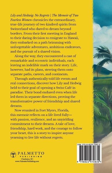 How can one live without regrets? In a unique and beautifully told story of their lives, best friends and co-authors Lily and Hedwig illustrate how holding onto a dream through thick and thin is the surest way to achieve it. Lily and Hedwig: No Regrets The Memoir of Two Fearless Women chronicles the extraordinary, true-life journey of two kindred spirits from Switzerland who dared to dream beyond borders. From their first meeting in England to their daring decision to emigrate to Hawaii, they embarked on a path brimming with unforgettable adventures, ambitious endeavors, and the pursuit of a shared vision. Along the way, they encountered a cast of remarkable and eccentric individuals, each leaving an indelible mark on their story. Life, however, had its plans, steering them onto separate paths, careers, and continents. Through authentically told life events and real connections, discover how Lily and Hedwig held to their goal of opening a Swiss Café in paradise. Their bond endured even when life led them in separate directions, proving the transformative power of friendship and shared dreams. Now reunited in Fort Myers, Florida, this memoir reflects on a life lived fully-with passion, resilience, and an unyielding commitment to their dreams. A tale of love, friendship, hard work, and the courage to follow your heart, this is a story to inspire anyone yearning to live life without regrets.