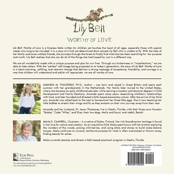 Lily Bell: Worthy of Love is intended for children and adults of all ages. It is a fable of a frail yet determined dove named Lily Bell who is unable to fly. With the help of her family and some unlikely friends, she journeys through the forest to finally find what she has been searching for: her purpose and worth.