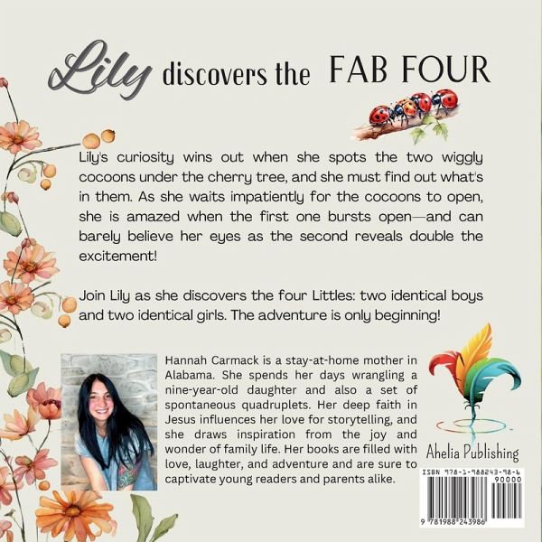 Lily Discovers the Fab Four is a delightful children's book that invites young readers into a world of wonder and imagination. When Lily, an adventurous older sister, stumbles upon four mysterious cocoons nestled in the forest, her curiosity ignites a magical journey. As she patiently watches over the cocoons, she discovers that they hold two identical girls and two identical boys-whom she affectionately calls "the Littles." Determined to care for her newfound friends, Lily introduces them to the vibrant life of the garden, where they embark on playful adventures together. This enchanting story beautifully illustrates themes of family, friendship, and the joy of nurturing others. With charming illustrations and a heartwarming narrative, Lily Discovers the Fab Four is perfect for children ages 4-8, encouraging imagination and a love for nature. Join Lily on her journey of discovery and see how love and care can transform the ordinary into the extraordinary!
