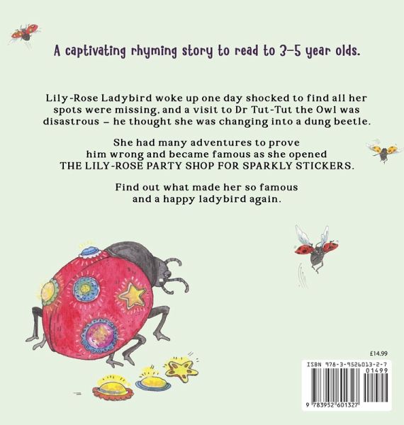 A captivating rhyming story to read to 3-5 year olds. Lily-Rose Ladybird woke up one day shocked to find all her spots were missing, and a visit to Dr Tut-Tut the Owl was disastrous - he thought she was changing into a dung beetle. She had many adventures to prove him wrong and became famous as she opened THE LILY-ROSE PARTY SHOP FOR SPARKLY STICKERS. Find out what made her so famous and a happy ladybird again.