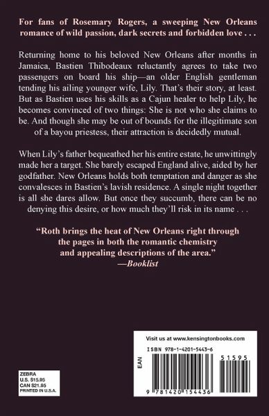 For fans of Rosemary Rogers, a sweeping New Orleans romance of wild passion, dark secrets and forbidden love . . . Returning home to his beloved New Orleans after months in Jamaica, Bastien Thibodeaux reluctantly agrees to take two passengers on board his ship-an older English gentleman tending his ailing younger wife, Lily. That's their story, at least. But as Bastien uses his skills as a Cajun healer to help Lily, he becomes convinced of two things: She is not who she claims to be. And though she may be out of bounds for the illegitimate son of a bayou priestess, their attraction is decidedly mutual. When Lily's father bequeathed her his entire estate, he unwittingly made her a target. She barely escaped England alive, aided by her godfather. New Orleans holds both temptation and danger as she convalesces in Bastien's lavish residence. A single night together is all she dares allow. But once they succumb, there can be no denying this desire, or how much they'll risk in its name . . . "Roth brings the heat of New Orleans right through the pages in both the romantic chemistry and appealing descriptions of the area." -Booklist