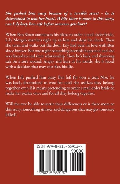 She pushed him away because of a terrible secret - he is determined to win her heart. While there is more to this story, can Lily keep Ben safe before someone gets hurt? When Ben Sloan announces his plans to order a mail order bride, Lily Morgan marches right up to him and slaps his cheek. Then she turns and walks out the door. Lily had been in love with Ben since forever. But one night something horrible happened and she was forced to end their relationship. Now he's back and throwing salt on a sore wound. Angry and hurt at his words, she is faced with a decision that may cost Ben his life.…mehr