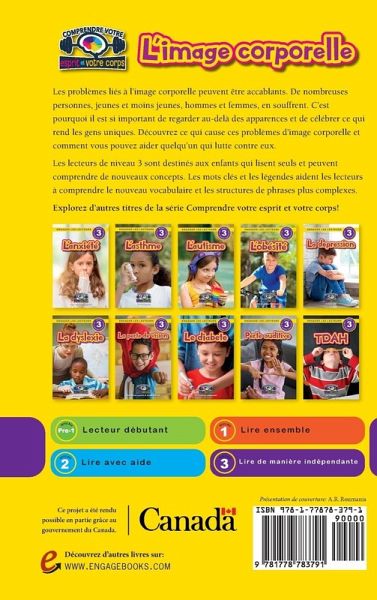 Les problèmes liés à l'image corporelle peuvent être accablants. De nombreuses personnes, jeunes et moins jeunes, hommes et femmes, en souffrent. C'est pourquoi il est si important de regarder au-delà des apparences et de célébrer ce qui rend les gens uniques. Découvrez ce qui cause ces problèmes d'image corporelle et comment vous pouvez aider quelqu'un qui lutte contre eux. Les lecteurs de niveau 3 sont destinés aux enfants qui lisent seuls et peuvent comprendre de nouveaux concepts. Les mots clés et les légendes aident les lecteurs à comprendre le nouveau vocabulaire et les structures de phrases plus complexes. Ce projet a été rendu possible en partie grâce au gouvernement du Canada.