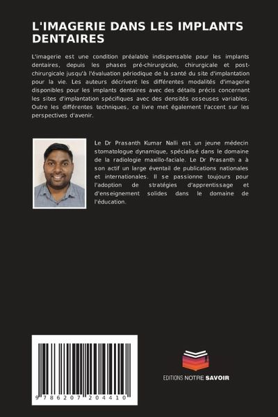 L'imagerie est une condition préalable indispensable pour les implants dentaires, depuis les phases pré-chirurgicale, chirurgicale et post-chirurgicale jusqu'à l'évaluation périodique de la santé du site d'implantation pour la vie. Les auteurs décrivent les différentes modalités d'imagerie disponibles pour les implants dentaires avec des détails précis concernant les sites d'implantation spécifiques avec des densités osseuses variables. Outre les différentes techniques, ce livre met également l'accent sur les perspectives d'avenir.