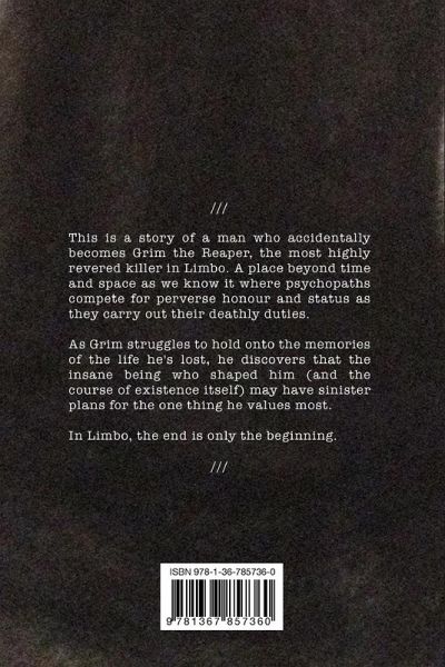 This is a story of a man who accidentally becomes Grim the Reaper, the most highly revered killer in Limbo. A place beyond time and space as we know it where psychopaths compete for perverse honour and status as they carry out their deathly duties. As Grim struggles to hold onto the memories of the life he's lost, he discovers that the insane being who shaped him (and the course of existence itself) may have sinister plans for the one thing he values most. In Limbo, the end is only the beginning.
