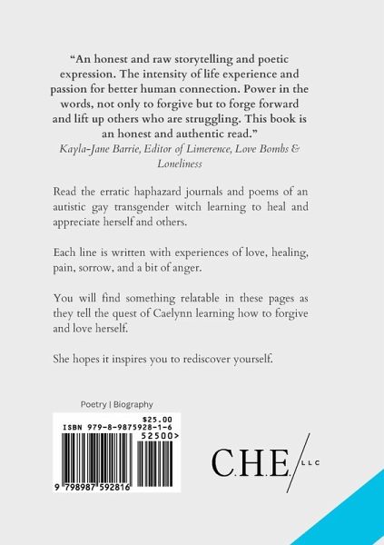 Read the erratic haphazard journals and poems of an autistic gay transgender witch learning to heal and appreciate herself and others. Each line is written with experiences of love, healing, pain, sorrow, and a bit of anger. You will find something relatable in these pages as they tell the quest of Caelynn learning how to forgive and love herself. She hopes it inspires you to rediscover yourself.