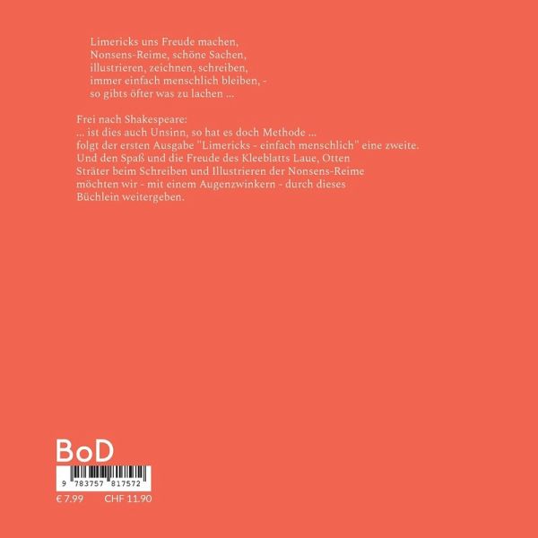 Limericks uns Freude machen,Nonsens-Reime, schöne Sachen,illustrieren, zeichnen, schreiben,immer einfach menschlich bleiben, -so gibts öfter was zu lachen... Frei nach Shakespeare:...ist dies auch Unsinn, so hat es doch Methode ...folgt der ersten Ausgabe "Limericks - einfach menschlich" eine zweite. Und den Spaß und die Freude des Kleeblatts Laue, Otten.Herausgeber: Hans-Jürgen Sträter, Adlerstein VerlagSträter beim Schreiben und Illustrieren der Nonsens-Reimemöchten wir - mit einem Augenzwinkern - durch diesesBüchlein weitergeben.