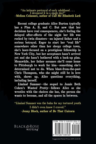 Recent college graduate Alice Burton typically has a Plan A, B, and C. But now that her decisions have real consequences, she's feeling the delayed after-effects of the night her life was rocked by twin disasters-an injured father and a serious betrayal. Eager to start her "real life" somewhere other than her sleepy college town, she's laser-focused on a prestigious fellowship in New York City, but her acceptance hasn't arrived yet and she hasn't bothered with a back-up plan. Meanwhile, her father assumes she'll come home to Pittsburgh to work for him-something she's determined not to do. When blast-from-the-past Chris Thompson, who she might still be in love with, shows up, Alice questions everything, including herself. Liminal Summer-the sequel to Jamie Beth Cohen's Wasted Pretty-follows Alice as she wrestles with the choices she has, the person she wants to become, and all the spaces in between.