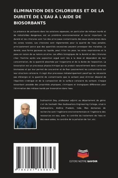 La présence de polluants dans les solutions aqueuses, en particulier de métaux lourds et de métalloïdes dangereux, est un problème environnemental et social important. La dureté et les chlorures sont l'un des principaux contaminants des eaux souterraines dans les zones rurales. Les chlorures sont réglementés pour la qualité de l'eau potable, principalement parce que des quantités excessives peuvent provoquer des maladies. La dureté, sous forme gazeuse ou liquide, peut irriter les yeux, les voies respiratoires et la peau en raison de sa nature alcaline. Les effets biologiques de la dureté et des chlorures chez l'homme après une exposition aiguë sont liés à la dose et dépendent de leur concentration, de la quantité absorbée par l'organisme et de la durée de l'exposition. La biosorption est un processus physiochimique qui se produit naturellement dans certaines biomasses et qui leur permet de concentrer et de fixer passivement les contaminants sur leur structure cellulaire. Il s'agit d'un processus métaboliquement passif qui ne nécessite pas d'énergie et la quantité de contaminants que le sorbant peut éliminer dépend de l'équilibre cinétique et de la composition de la surface cellulaire du sorbant. Chaque biosorbant possède des propriétés physiques, chimiques et biologiques différentes pour l'élimination des métaux lourds par biosorption dans l'eau.