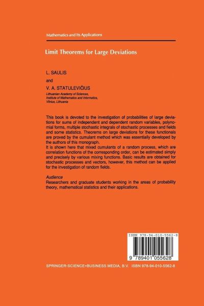 1. The main notions.- 2. The main lemmas.- 2.1. General lemmas on the approximation of distribution of an arbitrary random variable by the normal distribution.- 2.2. Proof of lemmas 2.1-2.4.- 3. Theorems on large deviations for the distributions of sums of independent random variables.- 3.1. Theorems on large deviations under Bernstein's condition.- 3.2. A theorem of large deviations in terms of Lyapunov's fractions.- 4. Theorems of large deviations for sums of dependent random variables.- 4.1. Estimates of the kth order centered moments of random processes with mixing.- 4.2. Estimates of mixed cumulants of random processes with mixing.- 4.3. Estimates of cumulants of sums of dependent random variables.- 4.4. Theorems and inequalities of large deviations for sums of dependent random variables.- 5. Theorems of large deviations for polynomial forms, multiple stochastic integrals and statistical estimates.- 5.1. Estimates of cumulants and theorems of large deviations for polynomial forms, polynomial Pitman estimates and U-statistics.- 5.2. Cumulants of multiple stochastic integrals and theorems of large deviations.- 5.3. Large deviations for estimates of the spectrum of a stationary sequence.- 6. Asymptotic expansions in the zones of large deviations.- 6.1. Asymptotic expansion for distribution density of an arbitrary random variable.- 6.2. Estimates for characteristic functions.- 6.3. Asymptotic expansion in the Cramer zone for distribution density of sums of independent random variables.- 6.4. Asymptotic expansions in integral theorems with large deviations.- 7. Probabilities of large deviations for random vectors.- 7.1. General lemmas on large deviations for a random vector with regular behaviour of cumulants.- 7.2. Theorems on large deviations for sums of randomvectors and quadratic forms.- Appendices.- Appendix 1. Proof of inequalities for moments and Lyapunov's fractions.- Appendix 2. Proof of the lemma on the representation of cumulants.- Appendix 3. Leonov - Shiryaev's formula.- References.