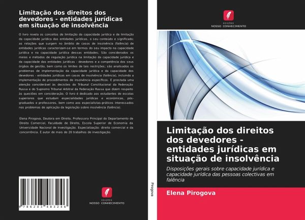O livro revela os conceitos de limitação da capacidade jurídica e de limitação da capacidade jurídica das entidades jurídicas, o seu conteúdo e significado; as relações que surgem no âmbito de casos de insolvência (falência) de entidades jurídicas caracterizam-se em termos do seu impacto na capacidade jurídica e na capacidade jurídica dessas entidades; São considerados os meios e métodos de regulação jurídica na limitação da capacidade jurídica e da capacidade das entidades jurídicas - devedores e a competência dos seus órgãos de gestão, bem como os limites de tais restrições; são analisados os problemas de implementação da capacidade jurídica e da capacidade dos devedores - entidades jurídicas em casos de insolvência (falência), incluindo a implementação de procedimentos de insolvência específicos. É prestada uma atenção considerável às decisões do Tribunal Constitucional da Federação Russa e do Supremo Tribunal Arbitral da Federação Russa que dizem respeito às questões em consideração. O livro é dedicado aos estudantes de escolas superiores que estudam especialidades jurídicas e económicas, pós-graduados e professores, bem como aos especialistas-práticos interessados nos problemas de aplicação da legislação sobre insolvência (falência).