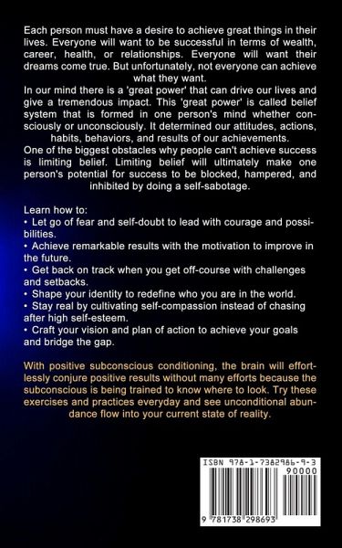 Each person must have a desire to achieve great things in their lives. Everyone will want to be successful in terms of wealth, career, health, or relationships. Everyone will want their dreams come true. But unfortunately, not everyone can achieve what they want. In our mind there is a 'great power' that can drive our lives and give a tremendous impact. This 'great power' is called belief system that is formed in one person's mind whether consciously or unconsciously. It determined our attitudes, actions, habits, behaviors, and results of our achievements. One of the biggest obstacles why people can't achieve success is limiting belief. Limiting belief will ultimately make one person's potential for success to be blocked, hampered, and inhibited by doing a self-sabotage. Learn how to:Let go of fear and self-doubt to lead with courage and possibilities. Achieve remarkable results with the motivation to improve in the future. Get back on track when you get off-course with challenges and setbacks. Shape your identity to redefine who you are in the world. Stay real by cultivating self-compassion instead of chasing after high self-esteem. Craft your vision and plan of action to achieve your goals and bridge the gap. With positive subconscious conditioning, the brain will effortlessly conjure positive results without many efforts because the subconscious is being trained to know where to look. Try these exercises and practices everyday and see unconditional abundance flow into your current state of reality.