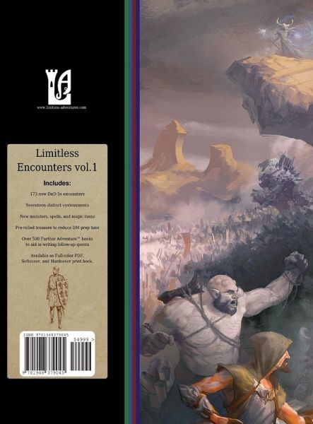 173 new DnD 5e encounters to expand your campaign setting, fill in sandbox or hex crawl adventures, and provide inspiration for writing your own campaigns. Encounters can easily be strung together to create thousands of possible quests and adventures. Seventeen distinct environments, including new monsters, spells, and magic items. Pre-rolled treasure to reduce DM prep time, and Over 500 Further AdventureTM hooks to aid in writing follow-up quests.