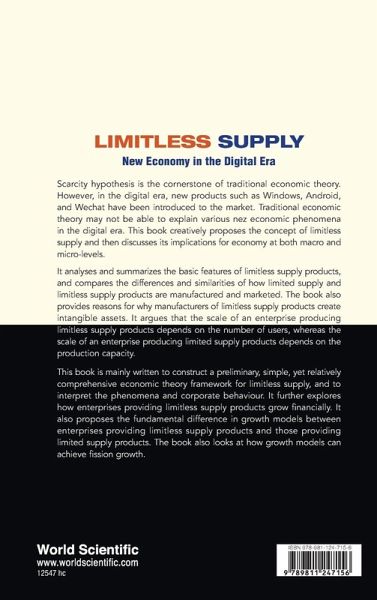 Scarcity hypothesis is the cornerstone of traditional economic theory. However, in the digital era, new products such as Windows, Android, and Wechat have been introduced to the market. Traditional economic theory may not be able to explain various nez economic phenomena in the digital era. This book creatively proposes the concept of limitless supply and then discusses its implications for economy at both macro and micro-levels. It analyses and summarizes the basic features of limitless supply products, and compares the differences and similarities of how limited supply and limitless supply products are manufactured and marketed. The book also provides reasons for why manufacturers of limitless supply products create intangible assets. It argues that the scale of an enterprise producing limitless supply products depends on the number of users, whereas the scale of an enterprise producing limited supply products depends on the production capacity. This book is mainly written to construct a preliminary, simple, yet relatively comprehensive economic theory framework for limitless supply, and to interpret the phenomena and corporate behaviour. It further explores how enterprises providing limitless supply products grow financially. It also proposes the fundamental difference in growth models between enterprises providing limitless supply products and those providing limited supply products. The book also looks at how growth models can achieve fission growth.