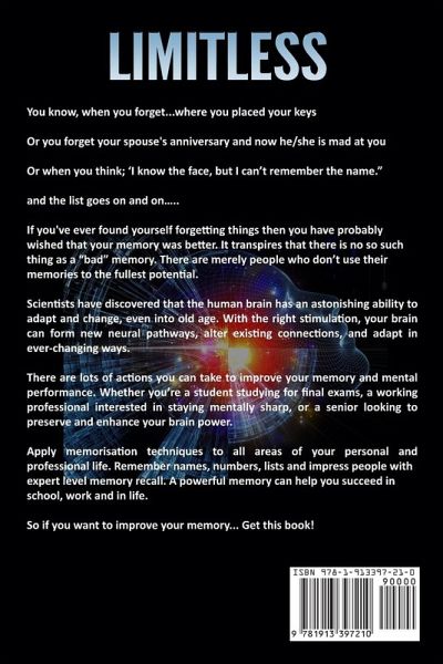 You know, when you forget...where you placed your keys…. Or you forget your spouse's anniversary and now he/she is mad at you….. Or when you think; 'I know the face, but I can't remember the name.".... and the list goes on and on….. If you've ever found yourself forgetting things then you have probably wished that your memory was better. It transpires that there is no so such thing as a "bad" memory. There are merely people who don't use their memories to the fullest potential. Scientists have discovered that the human brain has an astonishing ability to adapt and change, even into old age. With the right stimulation, your brain can form new neural pathways, alter existing connections, and adapt in ever-changing ways. There are lots of actions you can take to improve your memory and mental performance. Whether you're a student studying for final exams, a working professional interested in staying mentally sharp, or a senior looking to preserve and enhance your brain power. Apply memorisation techniques to all areas of your personal and professional life. Remember names, numbers, lists and impress people with expert level memory recall. A powerful memory can help you succeed in school, work and in life. So if you want to improve your memory... Get this book!